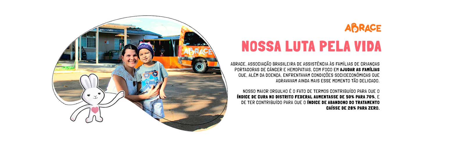 Assim nasceu a Abrace, Associação Brasileira de Assistência às Famílias de Crianças Portadoras de Câncer e Hemopatias, com foco em ajudar as famílias que, além da doença, enfrentavam condições socioeconômicas que agravavam ainda mais esse momento tão delicado. Nosso maior orgulho é o fato de termos contribuído para que o índice de cura no Distrito Federal aumentasse de 50% para 70%, e de ter contribuído para que o índice de abandono do tratamento caísse de 28% para ZERO.