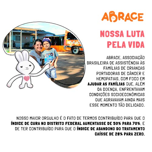Assim nasceu a Abrace, Associação Brasileira de Assistência às Famílias de Crianças Portadoras de Câncer e Hemopatias, com foco em ajudar as famílias que, além da doença, enfrentavam condições socioeconômicas que agravavam ainda mais esse momento tão delicado. Nosso maior orgulho é o fato de termos contribuído para que o índice de cura no Distrito Federal aumentasse de 50% para 70%, e de ter contribuído para que o índice de abandono do tratamento caísse de 28% para ZERO.