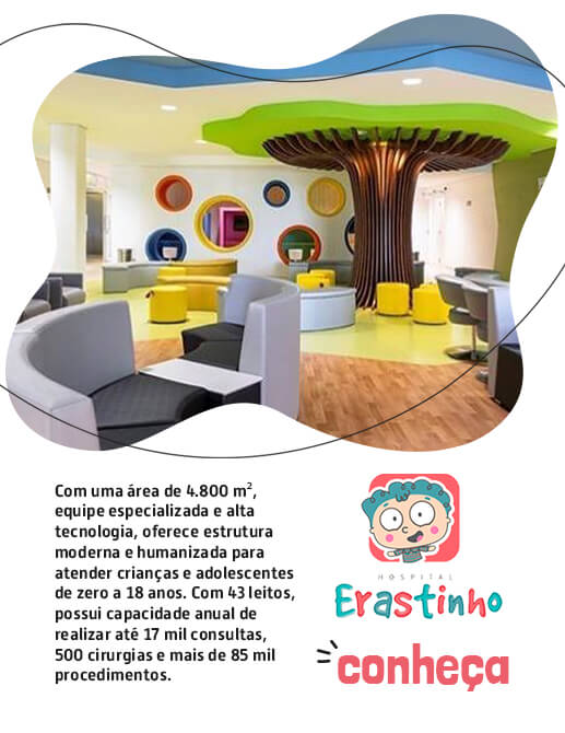 O Hospital Erastinho está localizado em Curitiba (PR) e possui área de 4.800 m², equipe especializada e alta tecnologia, oferece estrutura moderna e humanizada para atender crianças e adolescentes de zero a 18 anos.